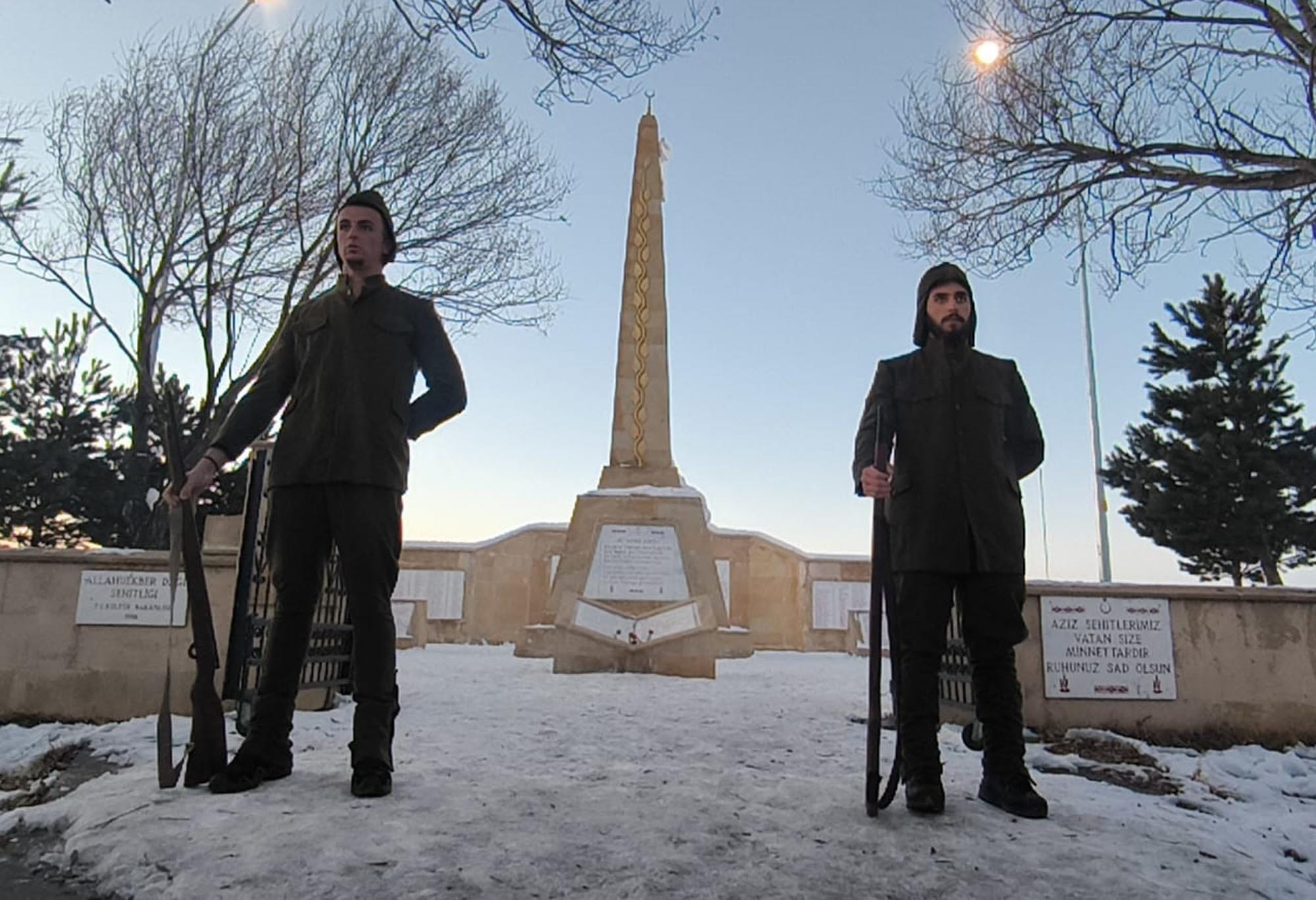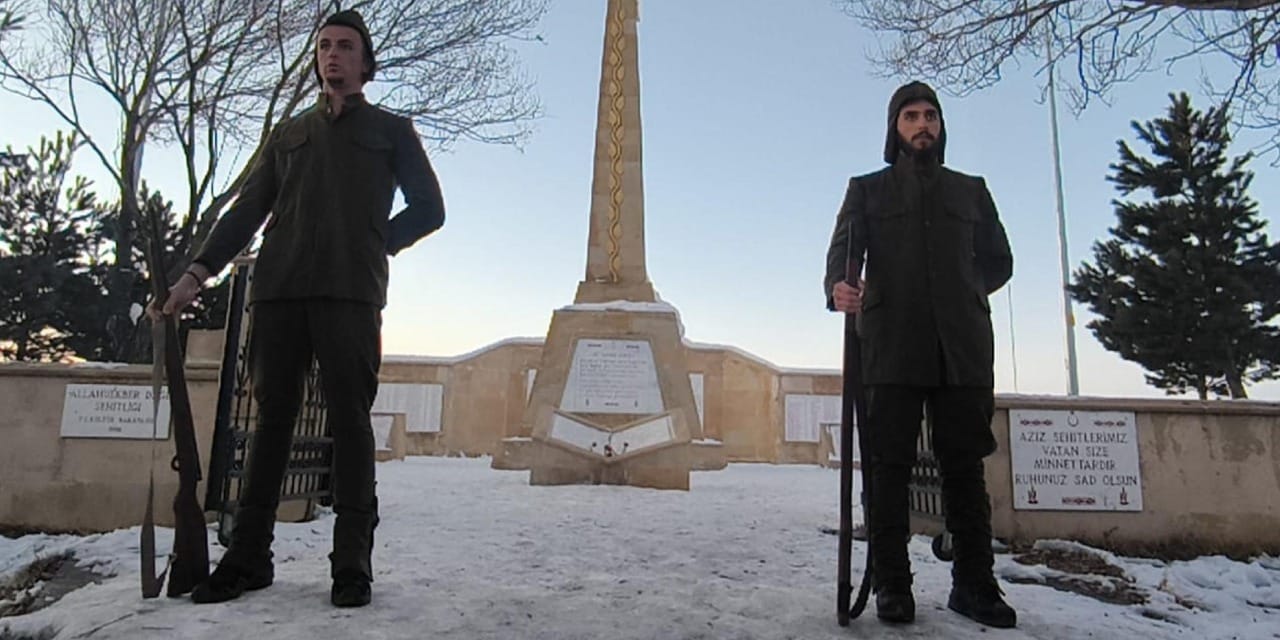 O dönemde yaşanılan zorlukları hissetmek adına asker kıyafeti giyen öğrenciler, değişimli olarak temsili saygı nöbeti tutarak, nöbet değişimi gerçekleştirdi. Hava sıcaklığının sıfırın altında 10 derece olduğu ilçede düzenlenen tören Kur’an-ı Kerim tilaveti ve duaların ardından sona erdi.