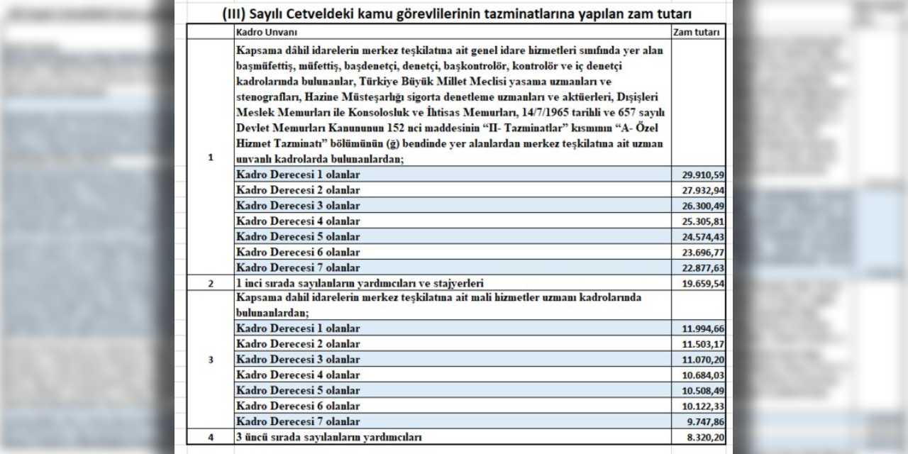Daire başkanı, grup başkanı gibi pozisyondakilerin maaşlarında 37.446,75 TL, bakanlık müşaviri, genel müdür yardımcısı ve eşdeğeri pozisyondaki kamu görevlilerinin maaşlarında 45.521,21 TL artış yapıldı.